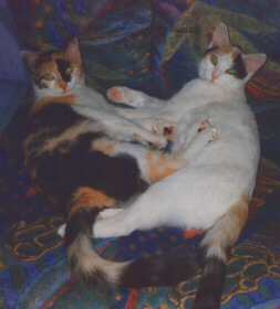 | In den letzten vier Jahren (rechts noch ein Jugendbild) haben sich die beiden Katzenfelle-mit-Inhalt höchst unterschiedlich entwickelt. Bella hat sich darauf spezialisiert eine möglichst große Masse aufzubauen, die sie besonders nachts einsetzt, wenn sie zu unserem und aller Fische Schrecken mit lautem Getöse vom Schrank auf die Aquarienabdeckung springt. Als Katze für schwierige Fälle greift sie nur dann in das Fang-die-geworfene-Maus-Spiel ein, wenn die Maus in den letzten Winkeln der Wohnung verschwindet. | ![]() |