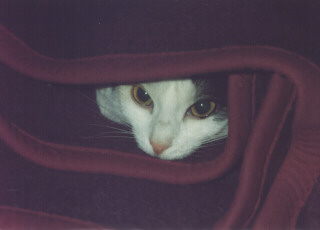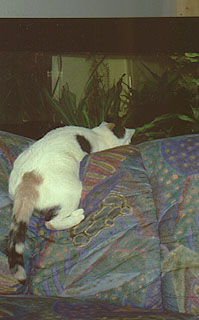 Mink bleibt dem Twiggy-Ideal und der Jagdleidenschaft treu. Letztere stürzte sie September 96 in das Unglück - genauer gesagt vom Wohnzimmerregal in den Abgrund. Die Folge war ein Riß aller Bänder am rechten Kniegelenk. Die Sportlerkatze war nur noch ein Anblick des Jammers. Sie konnte sich gerade einen Meter weit schleppen und blieb dann liegen. Jedesmal wenn sie sich anders hinlegte jaulte sie laut auf. |