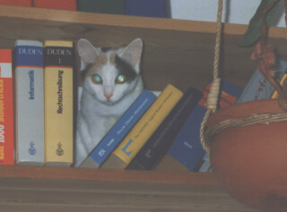 | So landete die Mink mit ihrem großen Horror vor Tierärzten wieder auf dem Operationstisch und bekam künstliche Bänder eingesetzt. Die Zeit danach war eine Tortur - für die Katze und uns. Wie hält man ein Aktivitätsbündel vom Springen ab? Mink kannte keine Schonzeit und mußte dann immer wieder für ihre Übermütigkeiten schmerzvoll büßen. Vier Monate später ist der Anti-Leck-Trichter längst wieder weggepackt, das kahlrasierte Hinterbein ist wieder befellt (haben Sie schon mal ein nacktes Katzenbein gesehen? Desillusionierend! Aber es fühlt sich sehr interessant an!!) und die Mink tollt wieder durch die Wohnung. Und wenn wir jetzt von größeren Geldbeträgen reden, rechnen wir sie immer in Katzensprünge um (1 neuer Rechner = 1 Katzensprung - und mein alter Golf war auch noch zwei Katzensprünge wert). |